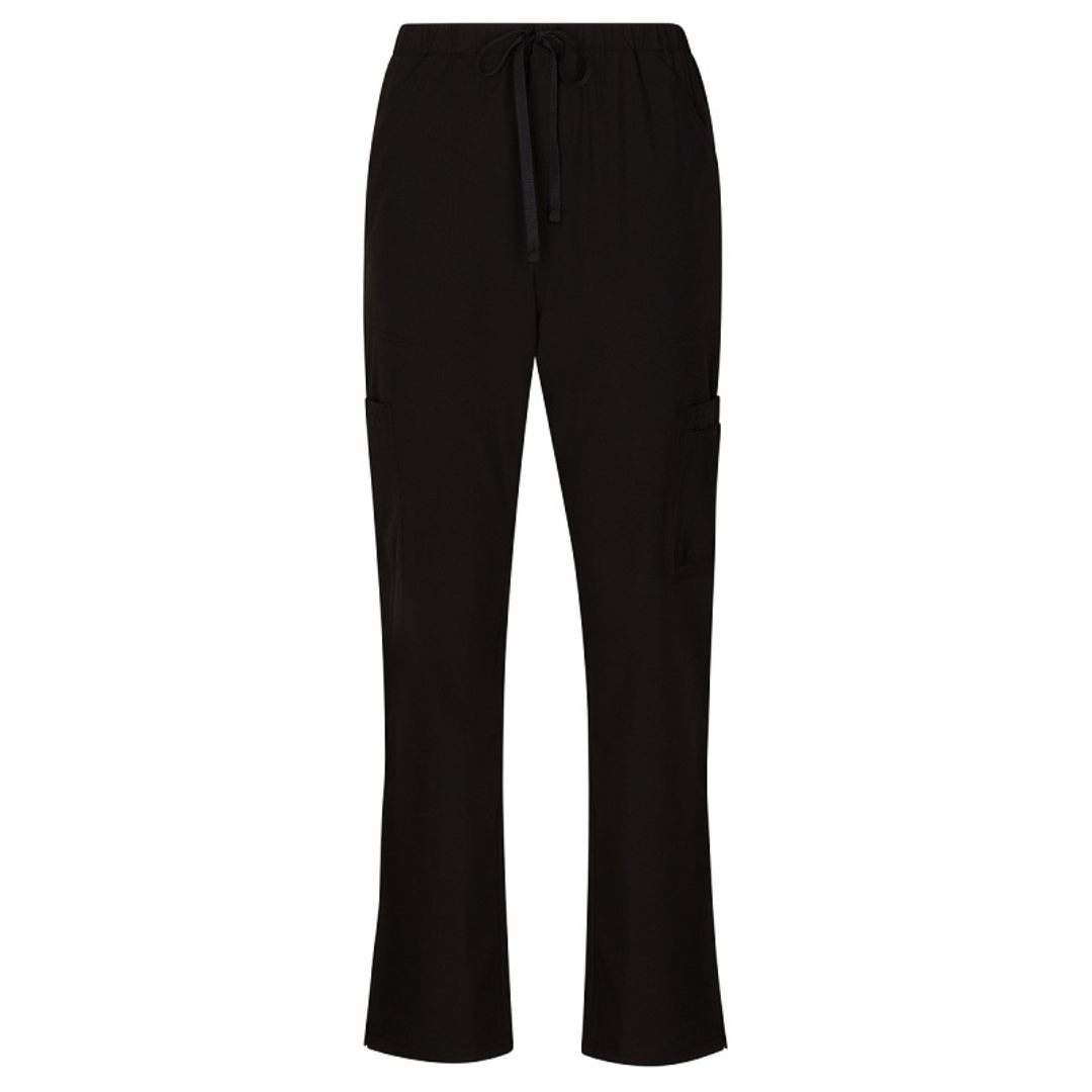 LOW-RISE ELASTIC WAISTBAND WITH DRAWSTRING TIE, 2- FRONT POCKETS AND 2-BACK POCKETS, 4- SIDE POCKETS INCLUDING HIDDEN CELL PHONE POCKET, STRAIGHT LEG WITH SIDE SLITS